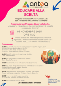 Fondata nel 1994, Antea Società Cooperativa Sociale si dedica a migliorare la qualità della vita della comunità tramite servizi sociali, socio-assistenziali ed educativi. Aderente alla Lega Nazionale delle Cooperative e Mutue, Antea opera nella Regione Campania, coprendo l’intera provincia di Salerno. La Cooperativa ha una forte presenza in aree come Cava de’ Tirreni-Costiera Amalfitana, Alto Sele-Tanagro, Cilento (Sapri) e Alta Irpinia.